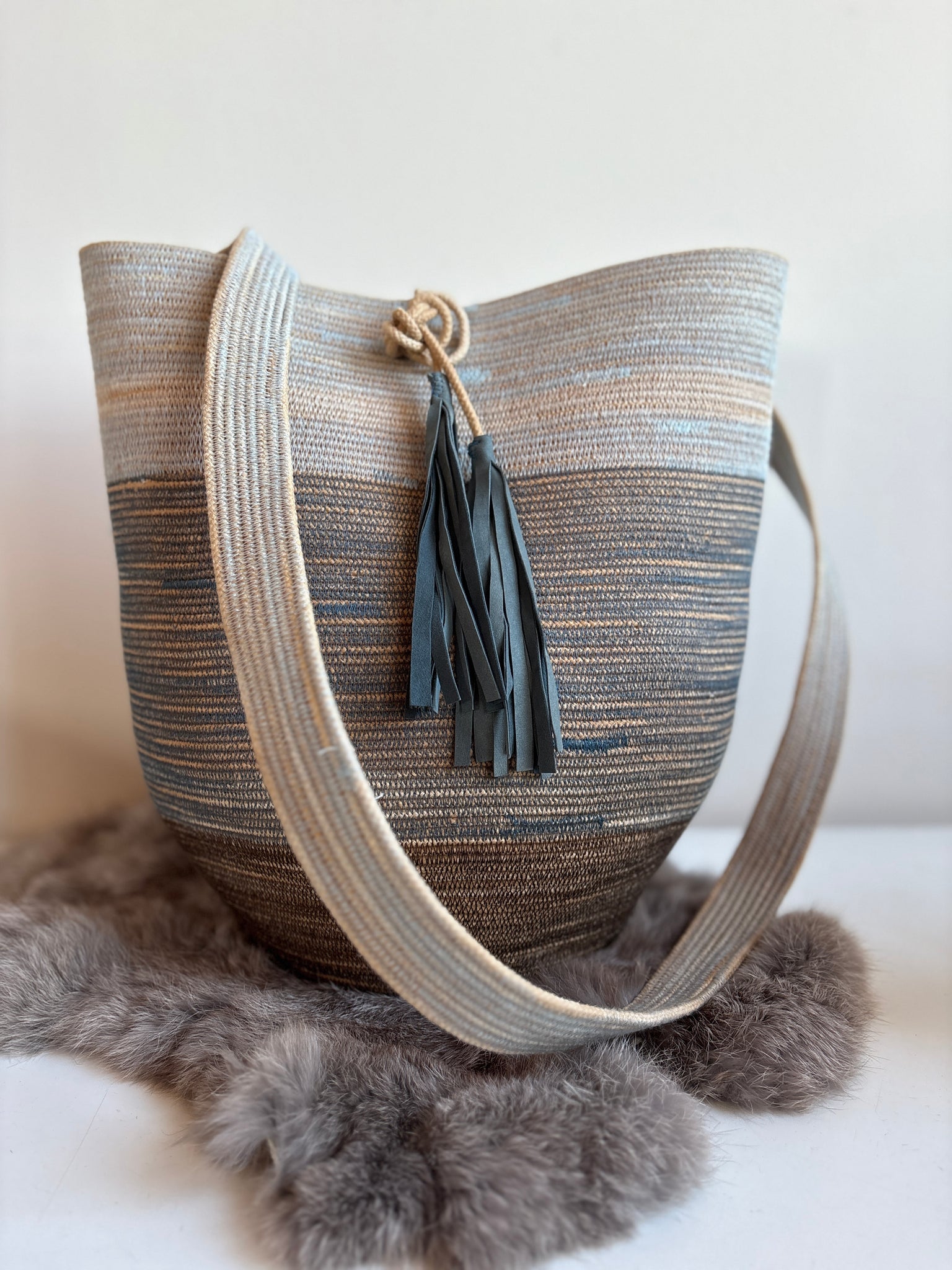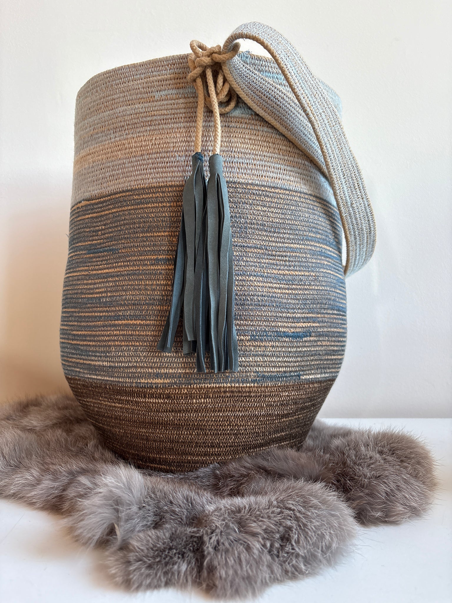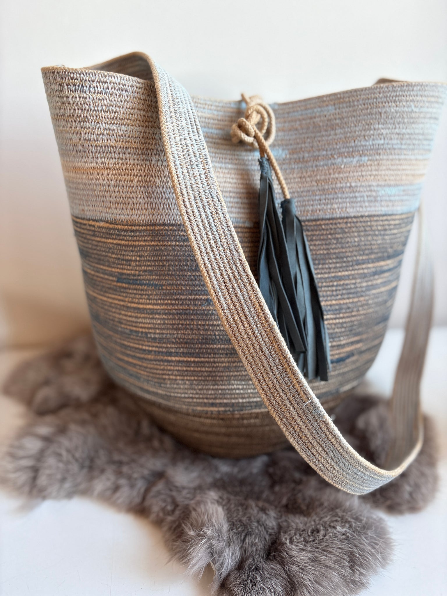 Each bag is made with Canadian made cotton rope with a poly-core for extra durability. I naturally dye the rope before sewing and shaping on my sewing machine.