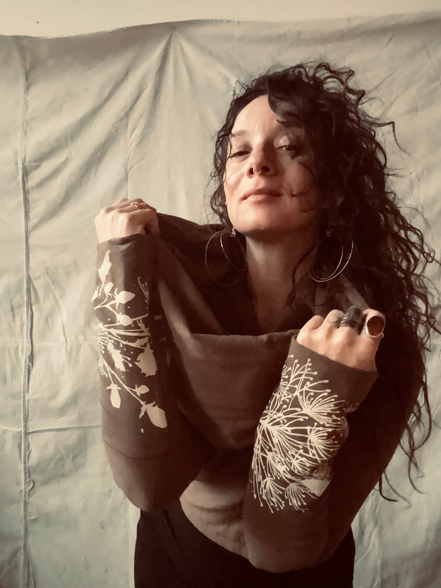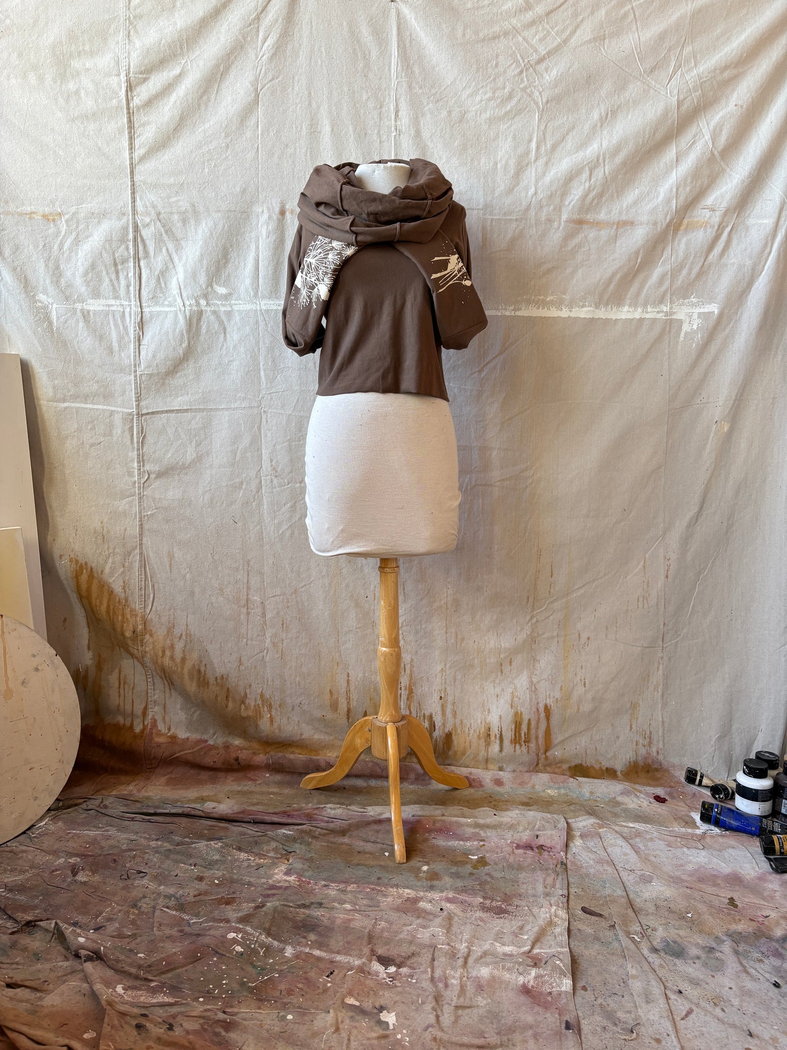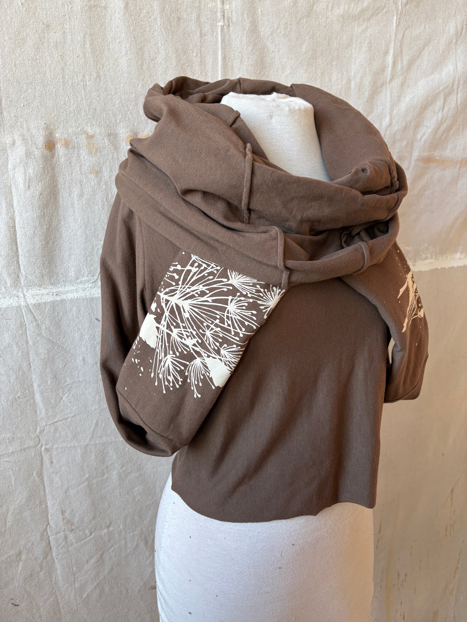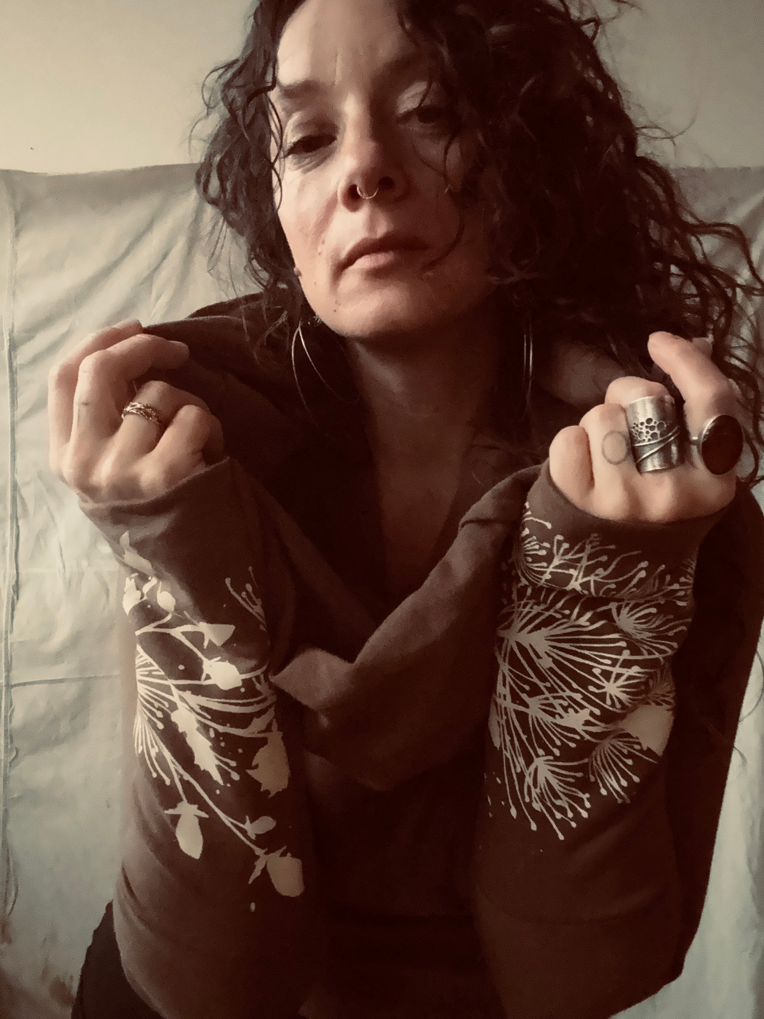 The LUNAR shrug is a cozy layer in either bamboo fleece or bamboo jersey. The added hand-pulled screenprint on the cuffs is original art by Kristie and adds an extra flare for that one-of-a-kind piece to add to your wardrobe.