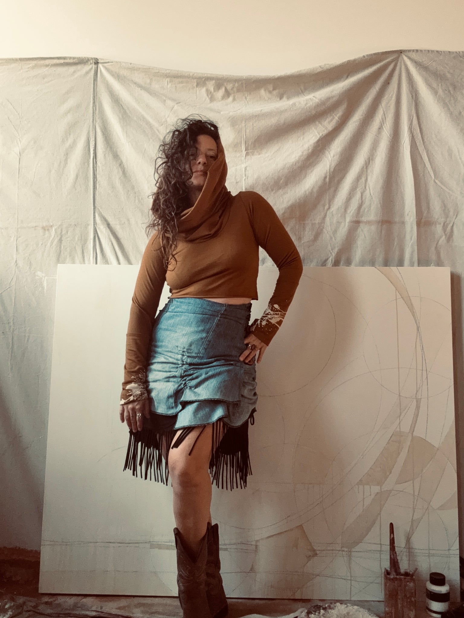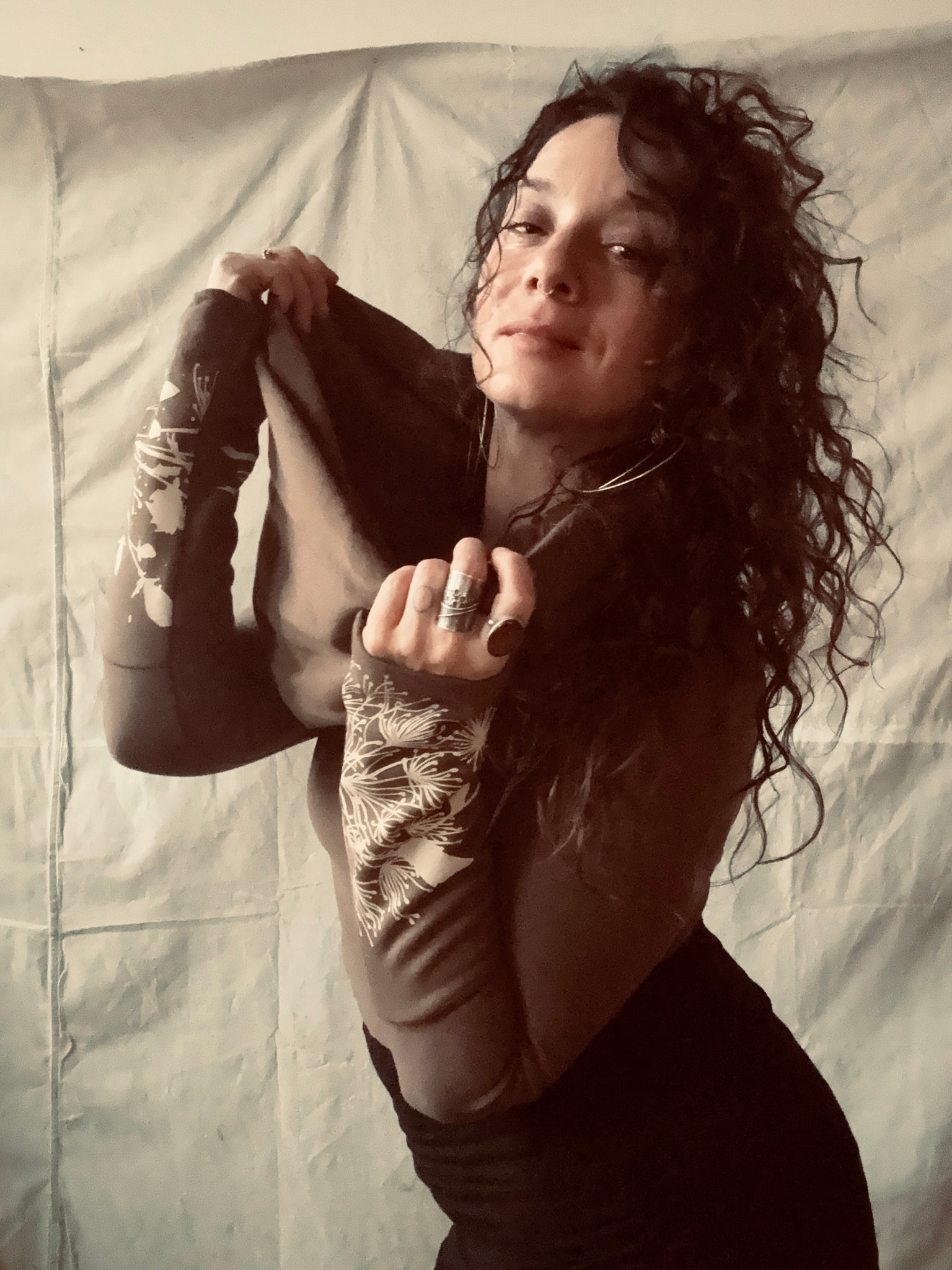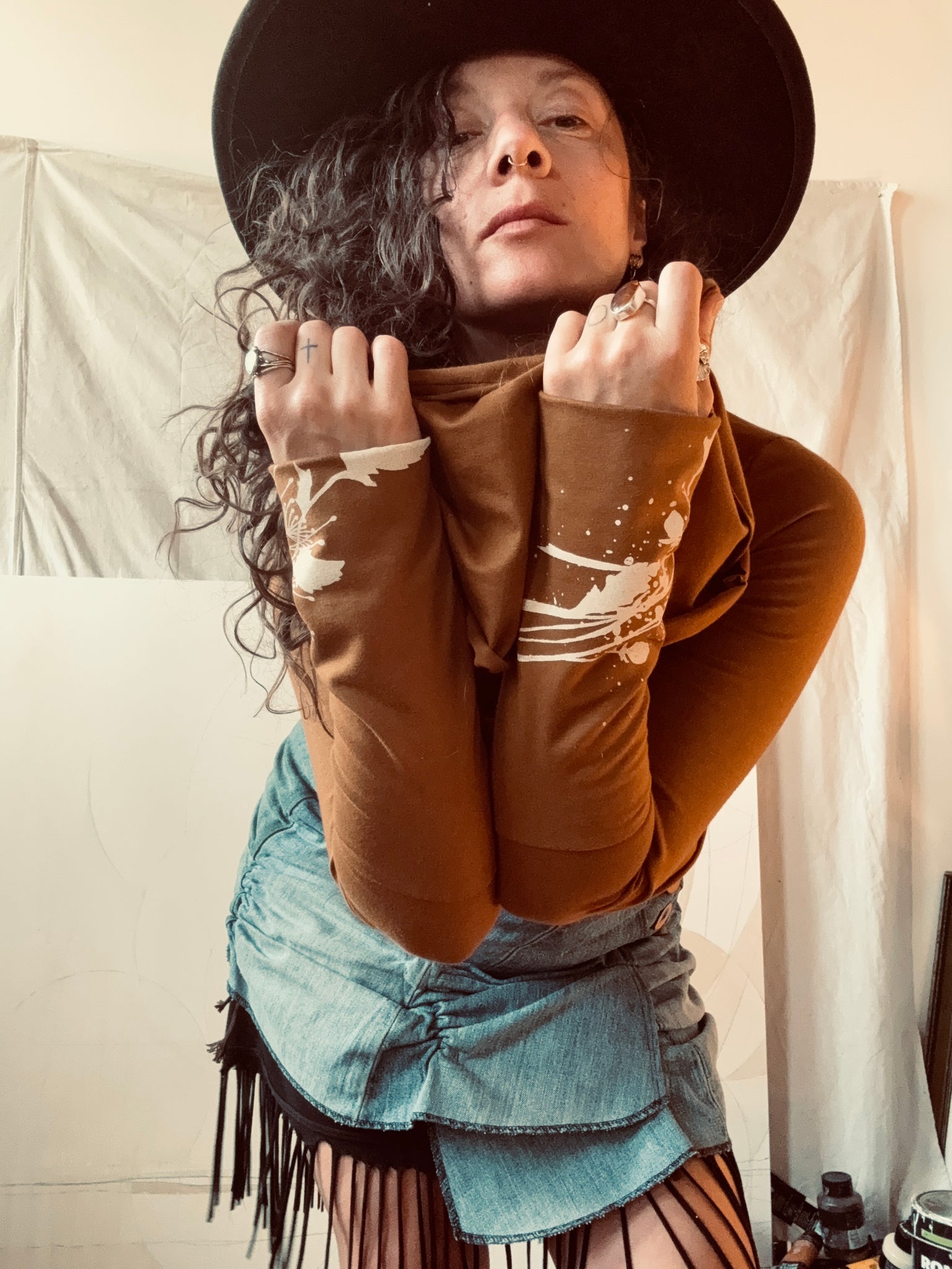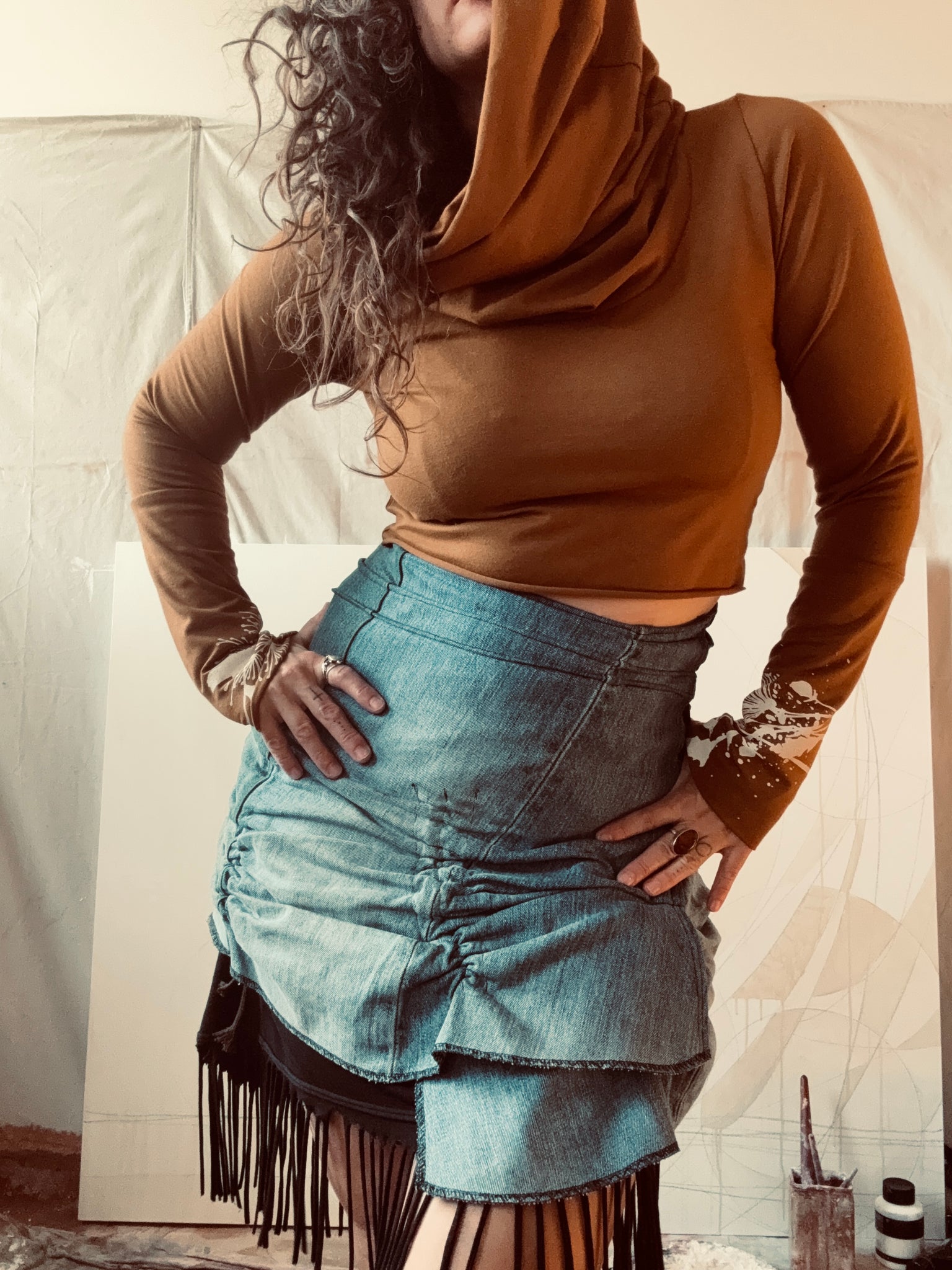 The LUNAR shrug is a cozy layer in either bamboo fleece or bamboo jersey. The added hand-pulled screenprint on the cuffs is original art by Kristie and adds an extra flare for that one-of-a-kind piece to add to your wardrobe.