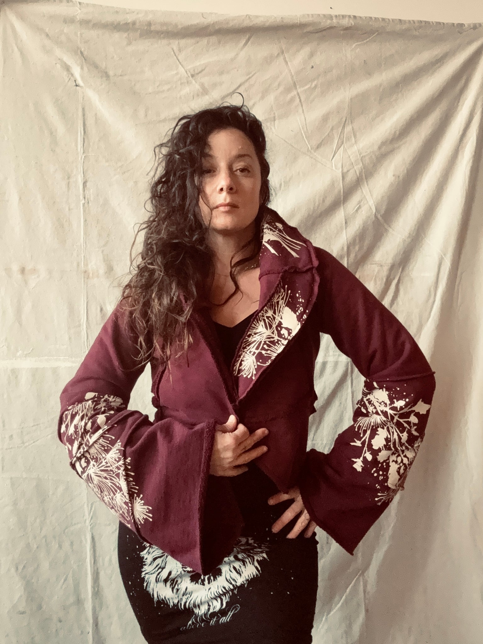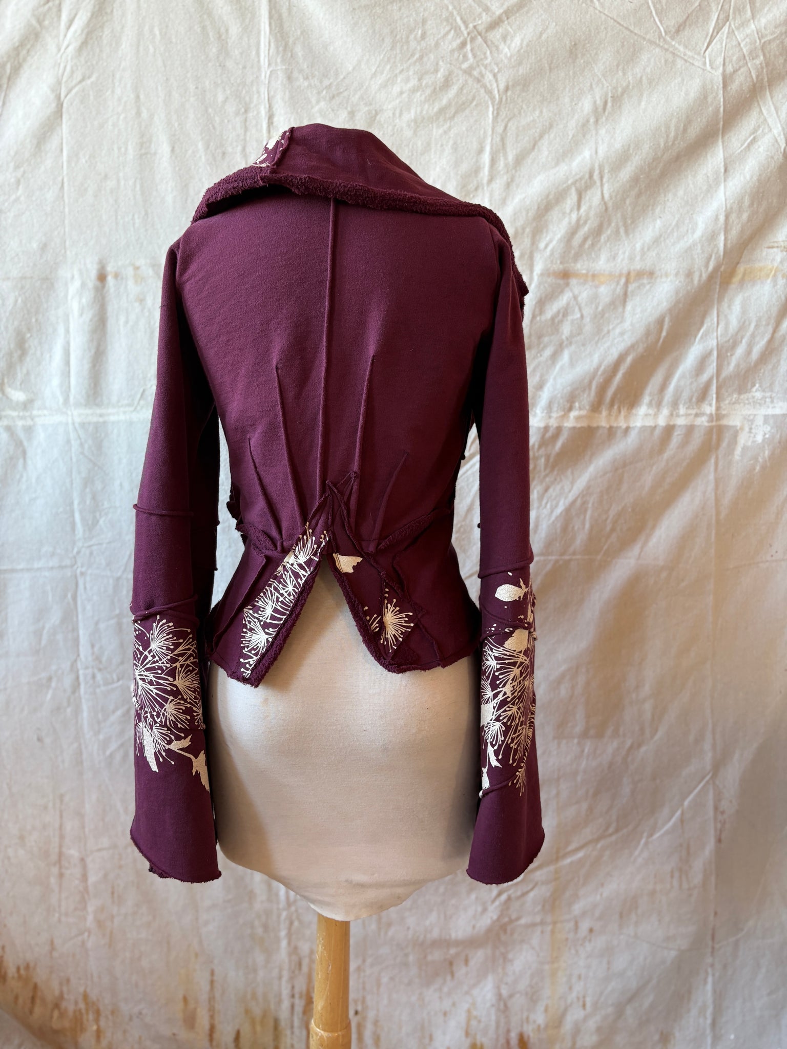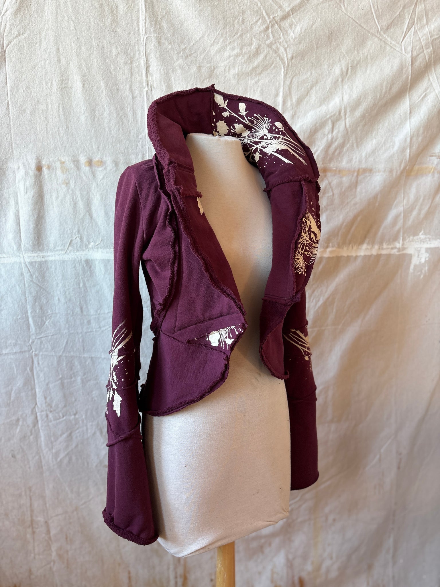 This one-of-a-kind SWALLOW-TAIL REVERE sweater is a variation on my Bolero jacket design. Made from a 100% cotton sweatshirt knit with no lycra; which allows a comfortable "give" but also a structured allowance for the rounded collar and flared sleeves. Akin to a blazer but cozy like a sweater, this piece is full of screenprinted patchwork and a flattering back with 'sun-ray' seams and a swallow-tail cut-out.