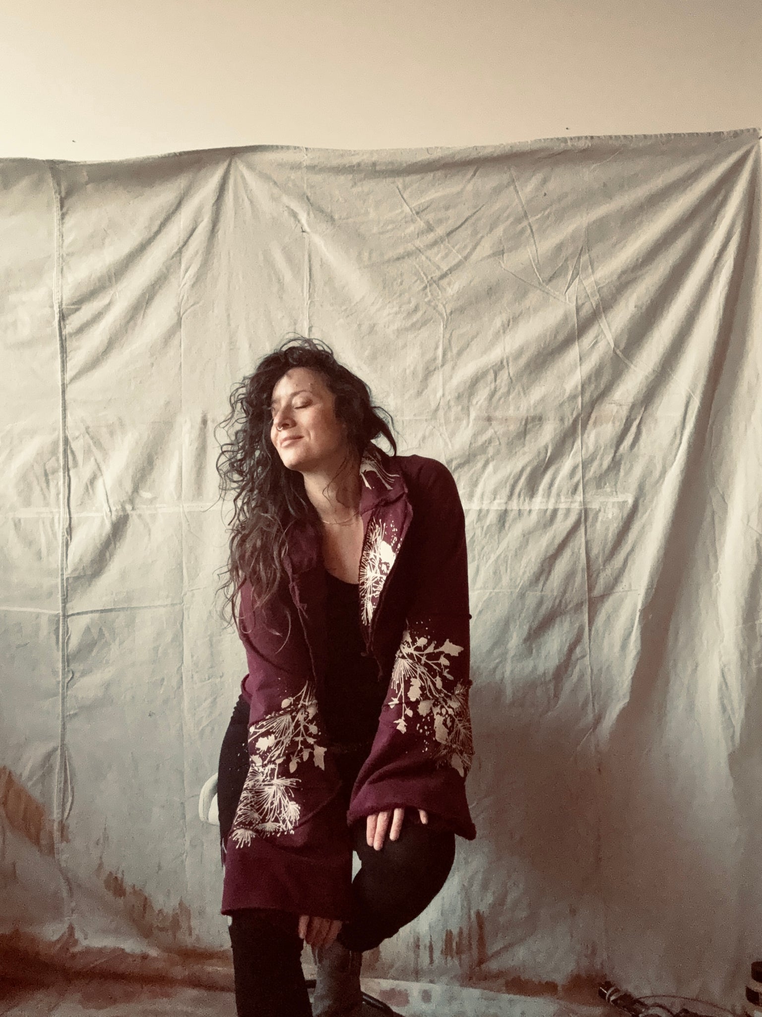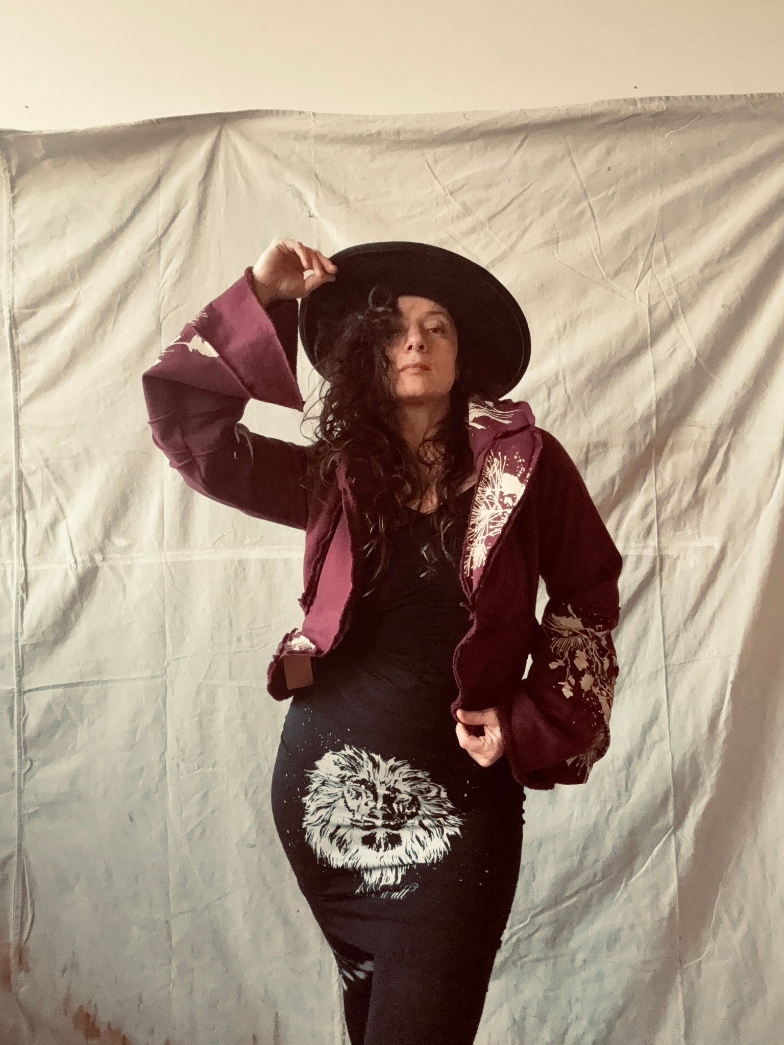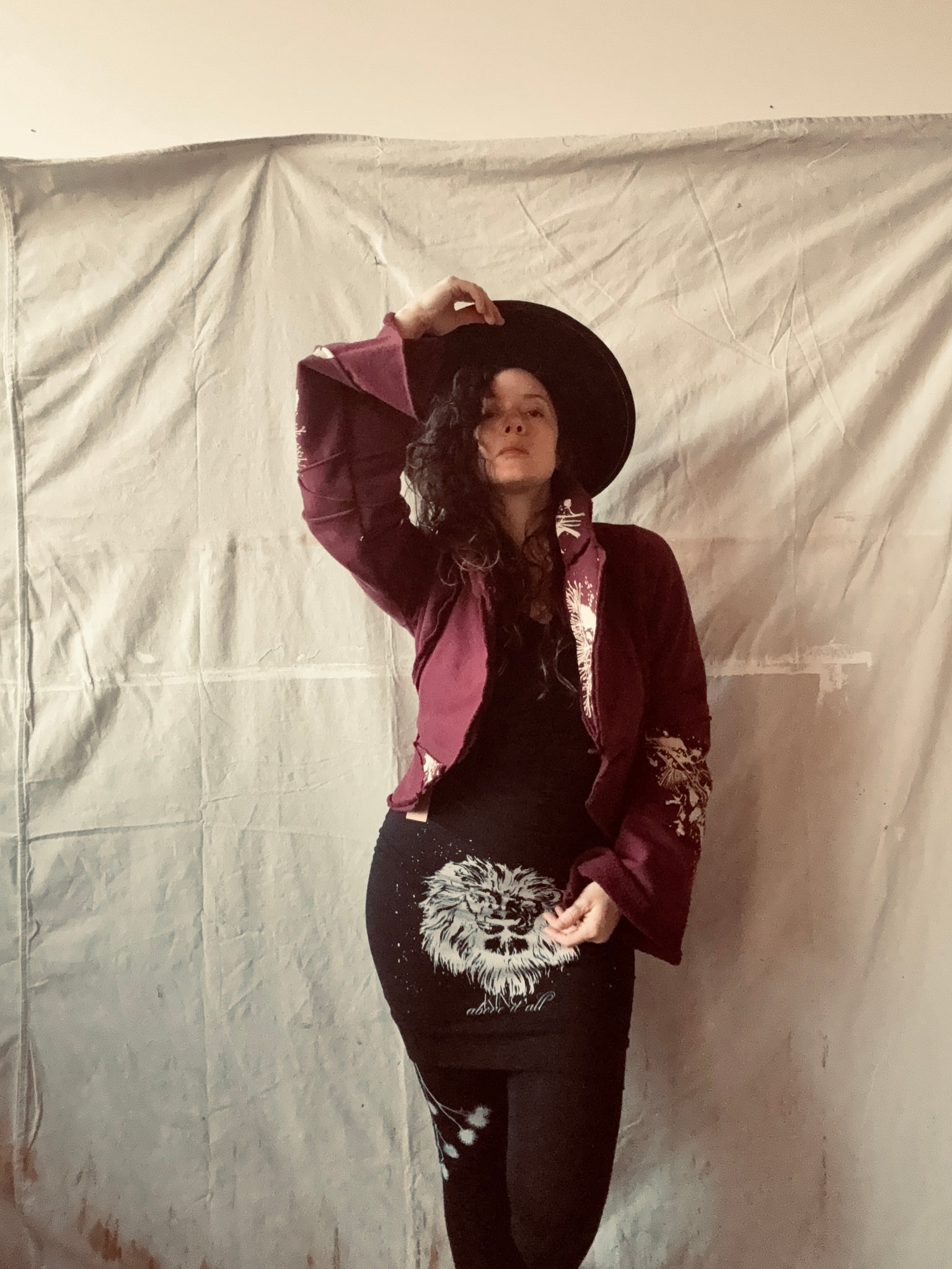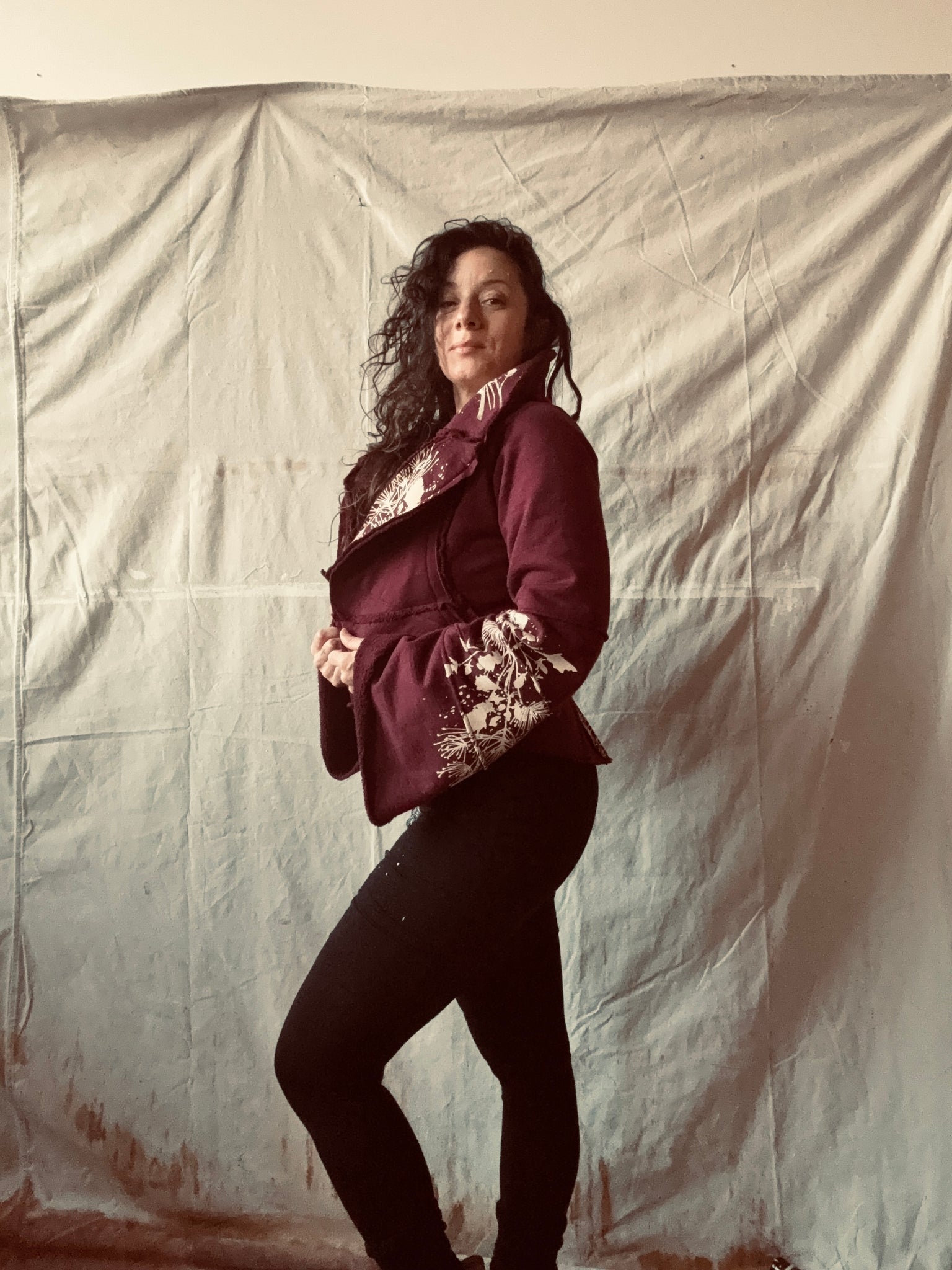 This one-of-a-kind SWALLOW-TAIL REVERE sweater is a variation on my Bolero jacket design. Made from a 100% cotton sweatshirt knit with no lycra; which allows a comfortable "give" but also a structured allowance for the rounded collar and flared sleeves. Akin to a blazer but cozy like a sweater, this piece is full of screenprinted patchwork and a flattering back with 'sun-ray' seams and a swallow-tail cut-out.